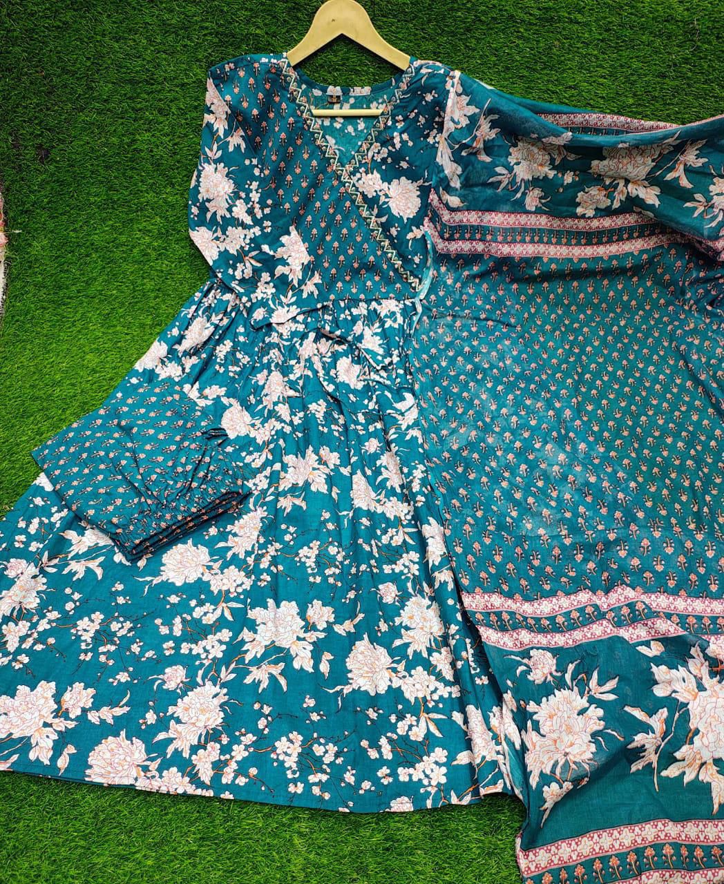 Immerse yourself in regal sophistication with the Angrakha with Sanganeri print 3-Piece Kurta Set from Bannisaa. This luxurious ensemble showcases an enchanting blend of rich emerald adorned with intricate golden floral motifs that dance across the fabric like poetry in motion. The coordinated dupatta with its delicate scattered blooms and ornate border creates a harmonious symphony of elegance, making this set perfect for weddings, festive celebrations, or any occasion where you want to radiate timeless grace and cultural richness.
