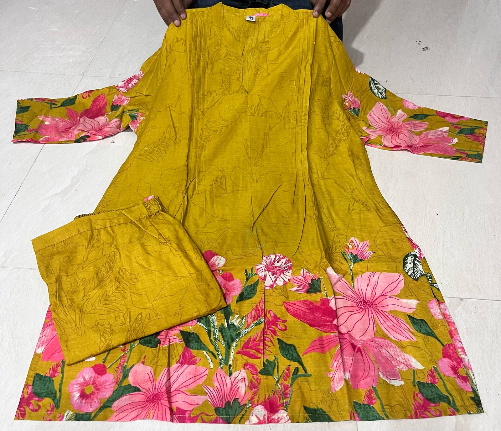 - Mustard yellow with vibrant pink floral motifs