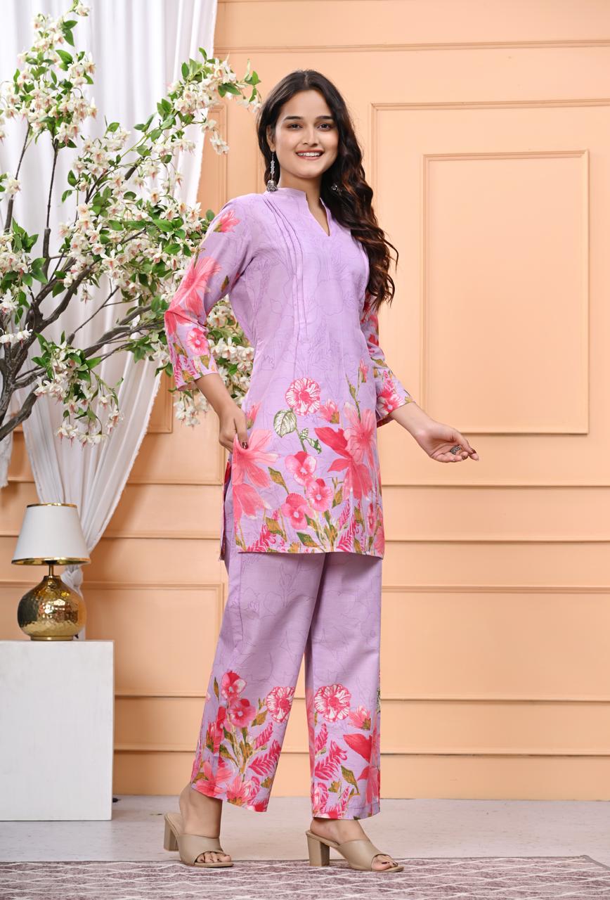 This stunning six-piece collection celebrates the beauty of nature with exquisite floral printed suit sets that capture the essence of a blooming garden. Each ensemble features contemporary straight-cut kurtas paired with coordinating palazzo pants, showcasing vibrant botanical prints that range from delicate watercolor florals to bold statement blooms. The collection includes elegant colorways in pristine white with peach roses, vibrant mustard with pink florals, rich fuchsia with golden blooms, regal purple with coral poppies, soft blush with coral botanicals, and romantic lavender with pink florals. Each set features placement printing with strategically positioned floral motifs that create stunning visual impact while maintaining sophisticated wearability. These modern interpretations of traditional Indian wear perfectly blend contemporary silhouettes with timeless floral artistry, making them ideal for spring celebrations, garden parties, casual outings, office wear, or any occasion where you want to embrace feminine elegance with nature-inspired beauty.