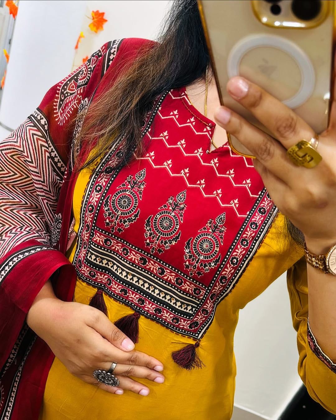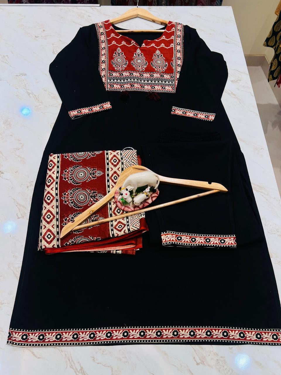 This elegant salwar suit offers timeless sophistication with its clean, minimalist design complemented by a stunning Ajrakh print dupatta. The solid black kurta features a comfortable straight cut with full sleeves, while the fitted salwar pants create a sleek silhouette. The highlight of this ensemble is the rich maroon dupatta adorned with traditional Ajrakh block print motifs in geometric and paisley patterns, adding a vibrant cultural touch to the classic black base. Perfect for office wear, casual outings, or when you want understated elegance with a pop of traditional artistry.