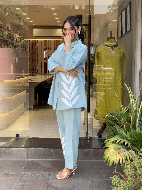 This stunning contemporary co-ord collection features a bold white leaf motif that creates striking visual impact across four sophisticated colorways. Each set includes a tailored shirt-style top with classic collar and button-front closure, paired with matching straight-cut pants featuring the same botanical print placement. Available in timeless black, vibrant coral pink, earthy sage green, and serene powder blue, these sets offer versatility for every mood and occasion. The modern leaf pattern adds an organic, fresh element to the clean silhouette, making these perfect for office wear, casual outings, weekend brunches, or contemporary festive occasions where you want to make a stylish statement with minimalist elegance.