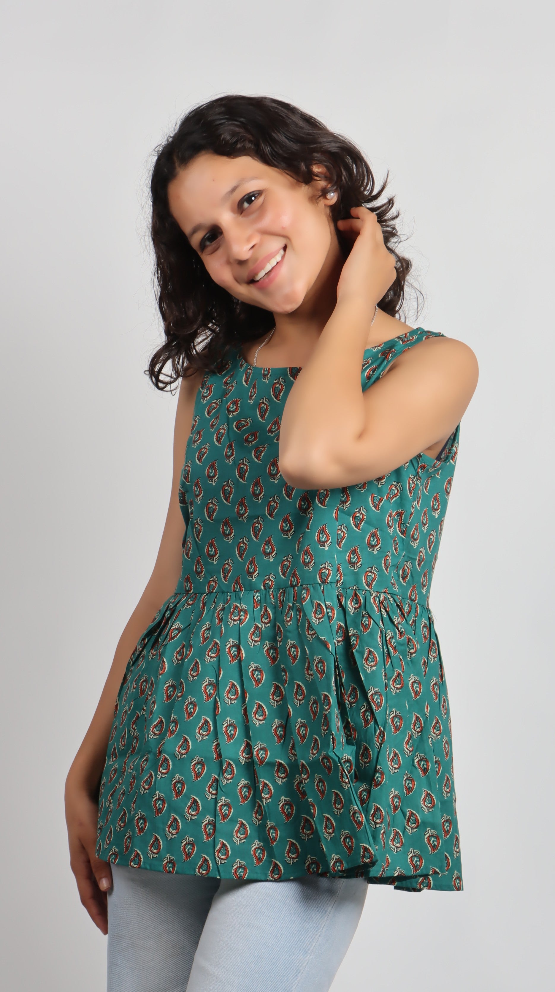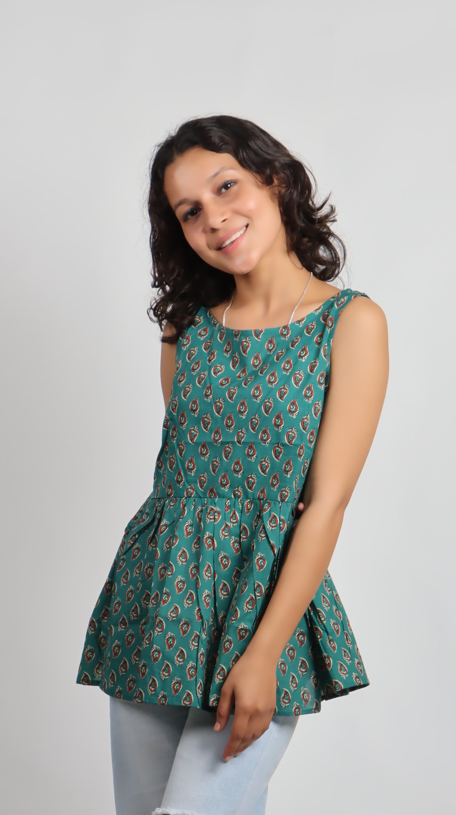 Add a splash of vibrant charm to your wardrobe with the Bannisaa Heritage Print Cotton Kurti. Crafted from pure cotton, this sleeveless peplum-style top brings together shades of green, maroon, orange, and teal in a playful hand-block print. Designed for comfort and style, it’s perfect for both casual outings and chic everyday wear.