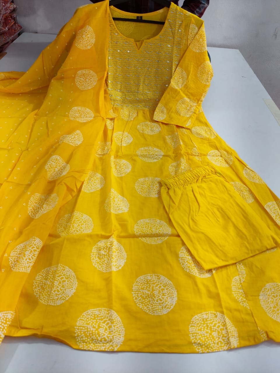 Top (Kurta): Vibrant mustard yellow base with golden circular block-print motifs, round neckline with three-quarter sleeves and gathered yoke detail