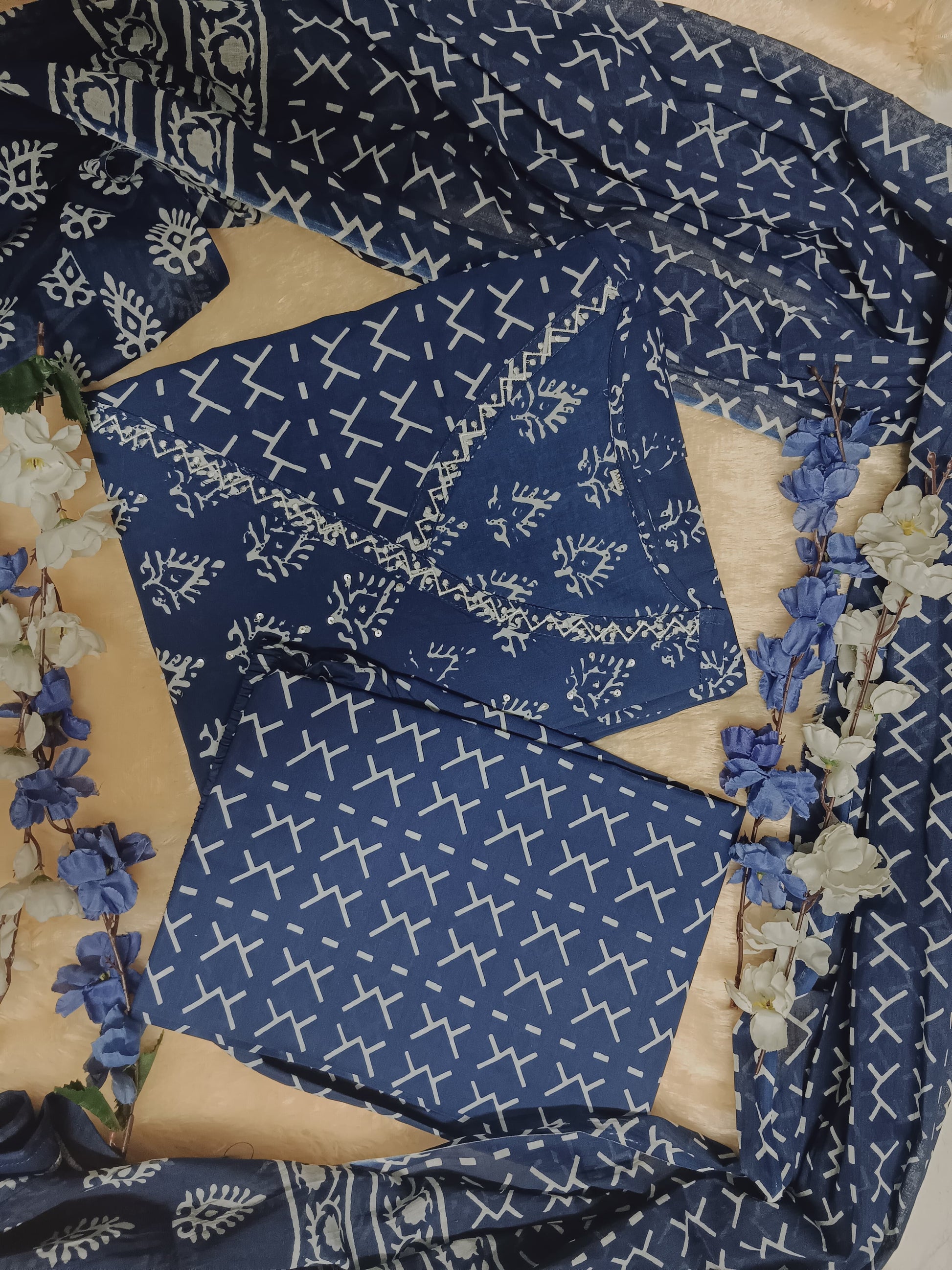 Top (Kurta): Navy blue cotton base with white floral and paisley block print motifs, V-neckline with three-quarter sleeves; Length - 48 inches; Sleeves - 3/4 sleeve