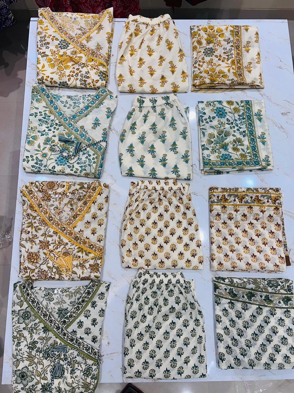 This elegant cream and mustard yellow kurta set showcases traditional Indian craftsmanship with a contemporary twist. The angrakha-style kurta features beautiful block print motifs in golden yellow scattered across the fabric, complemented by intricate floral borders. The wrap-around design with tie-up detailing adds a graceful silhouette, while the coordinated palazzo pants ensure comfort and style. The matching dupatta with ornate border prints and scattered motifs completes this sophisticated ensemble, perfect for festive occasions, cultural events, and special celebrations.