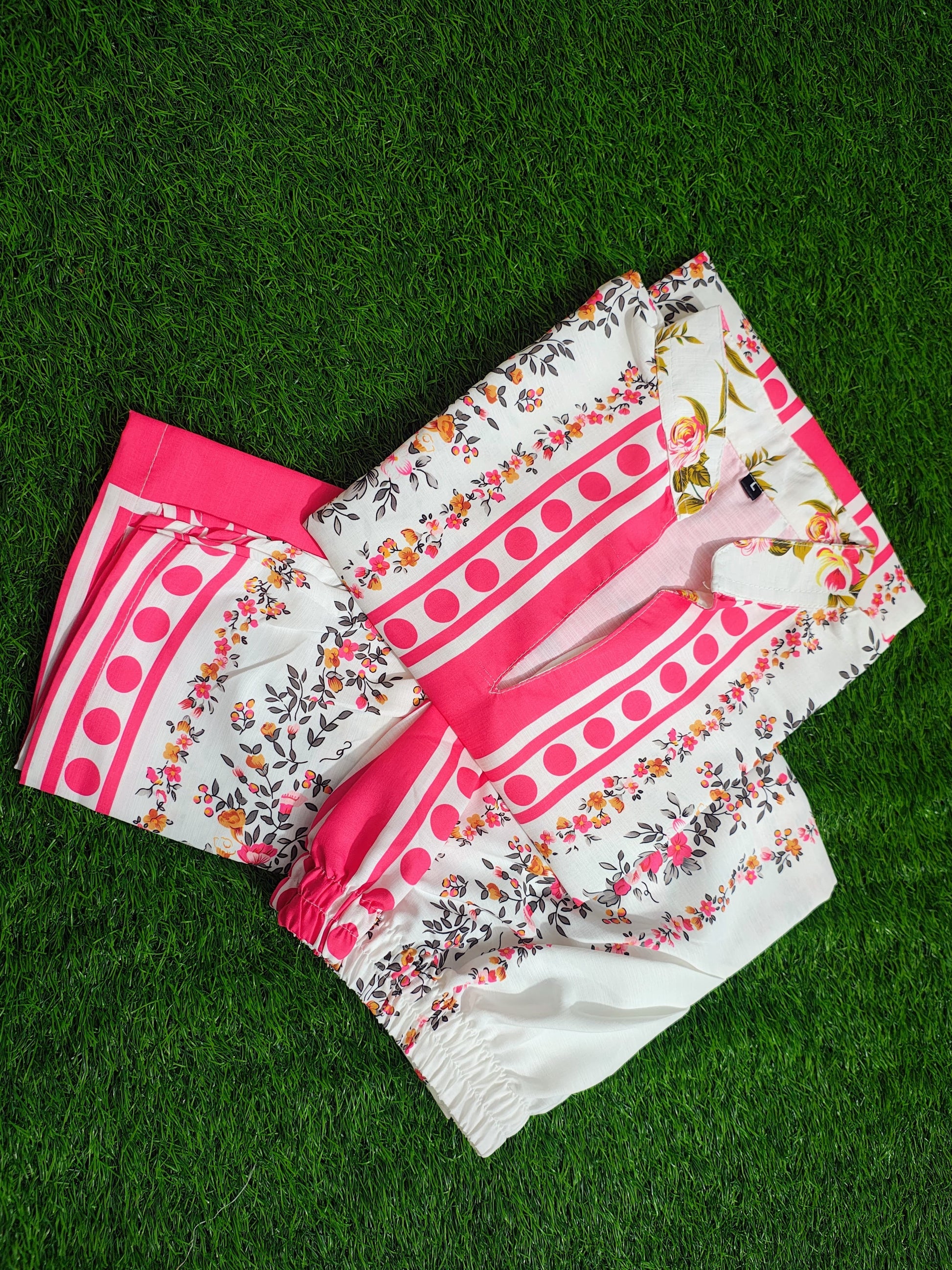 Bottom: Straight-leg pants with matching floral prints and fuchsia geometric border detailing along sides and hem