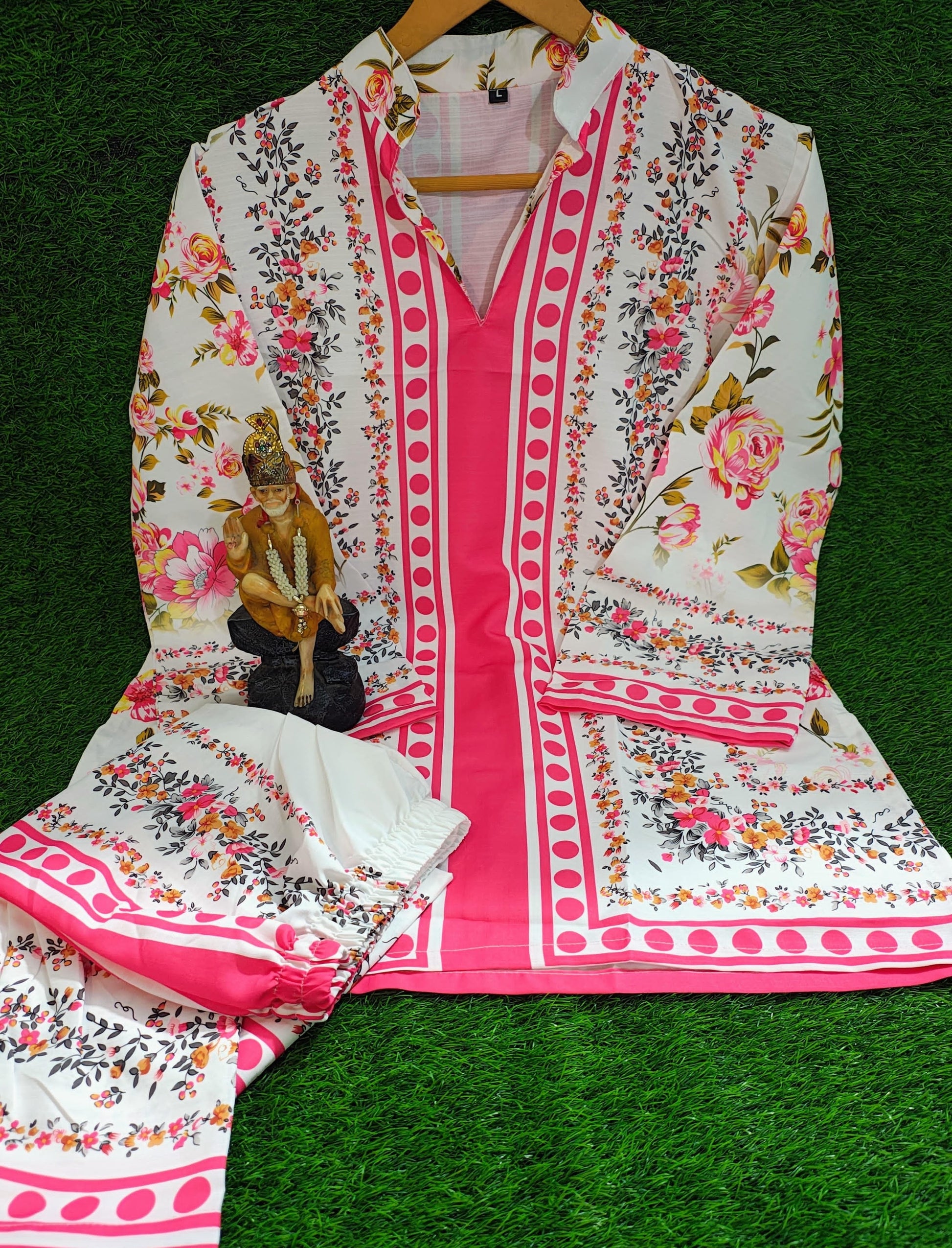Top (Tunic): Long-line tunic with pink rose and botanical prints, paisley detailing, mandarin collar with decorative placket, full sleeves with contrasting fuchsia cuffs and borders