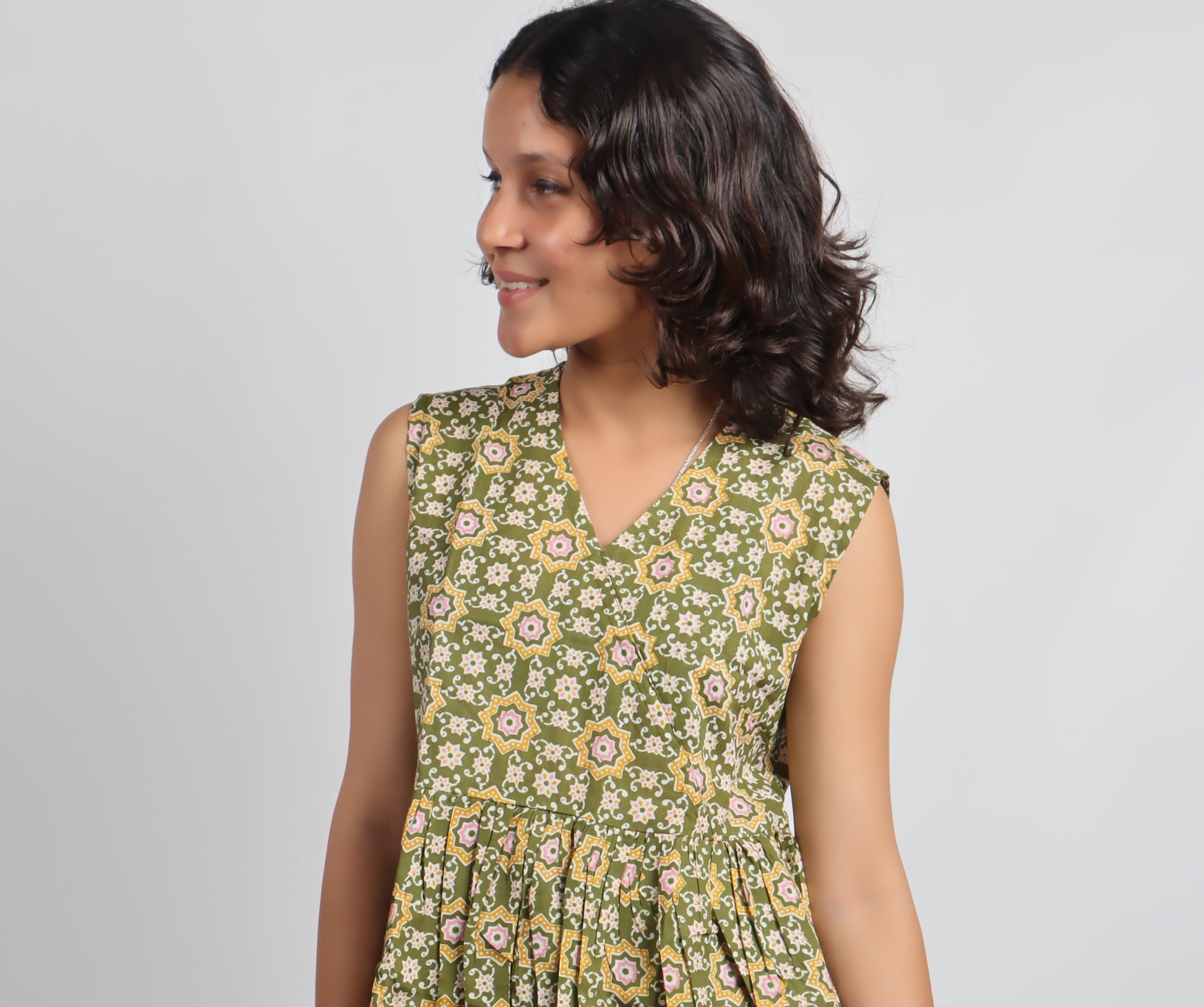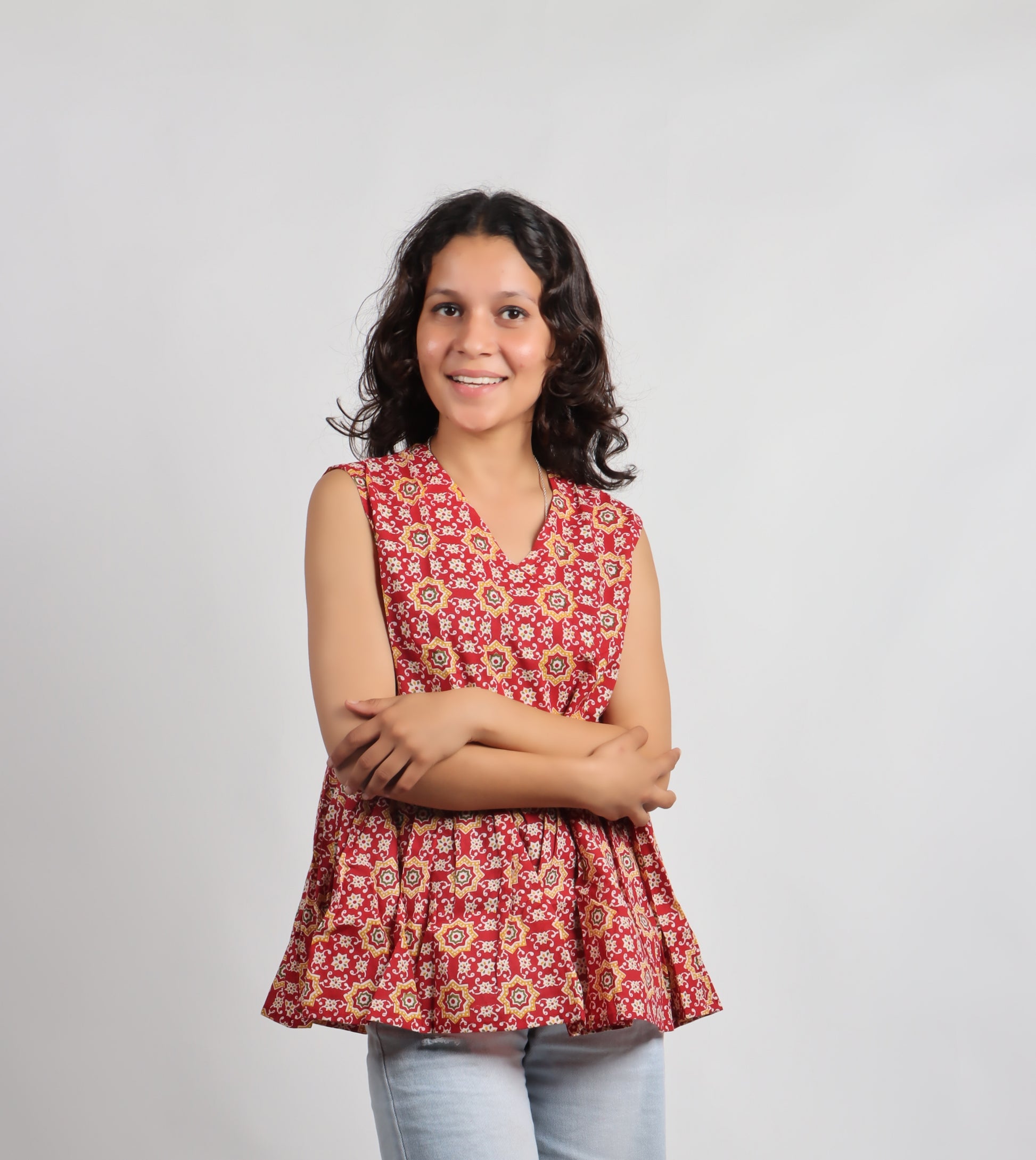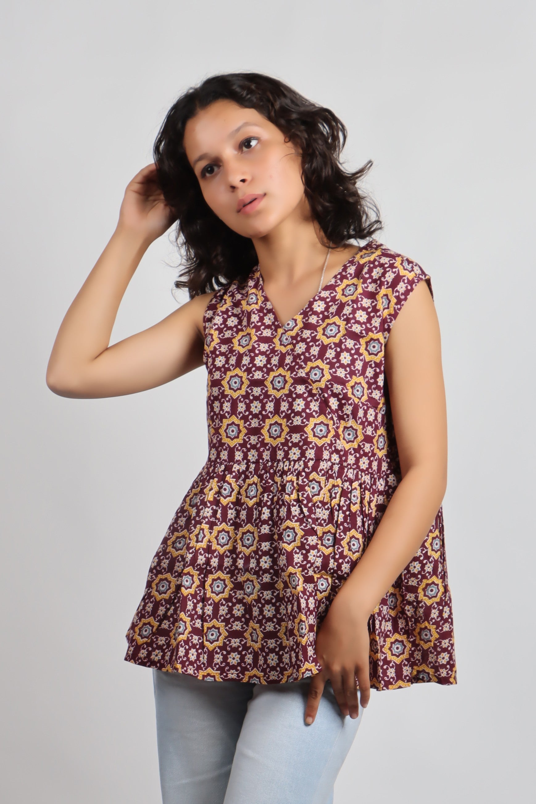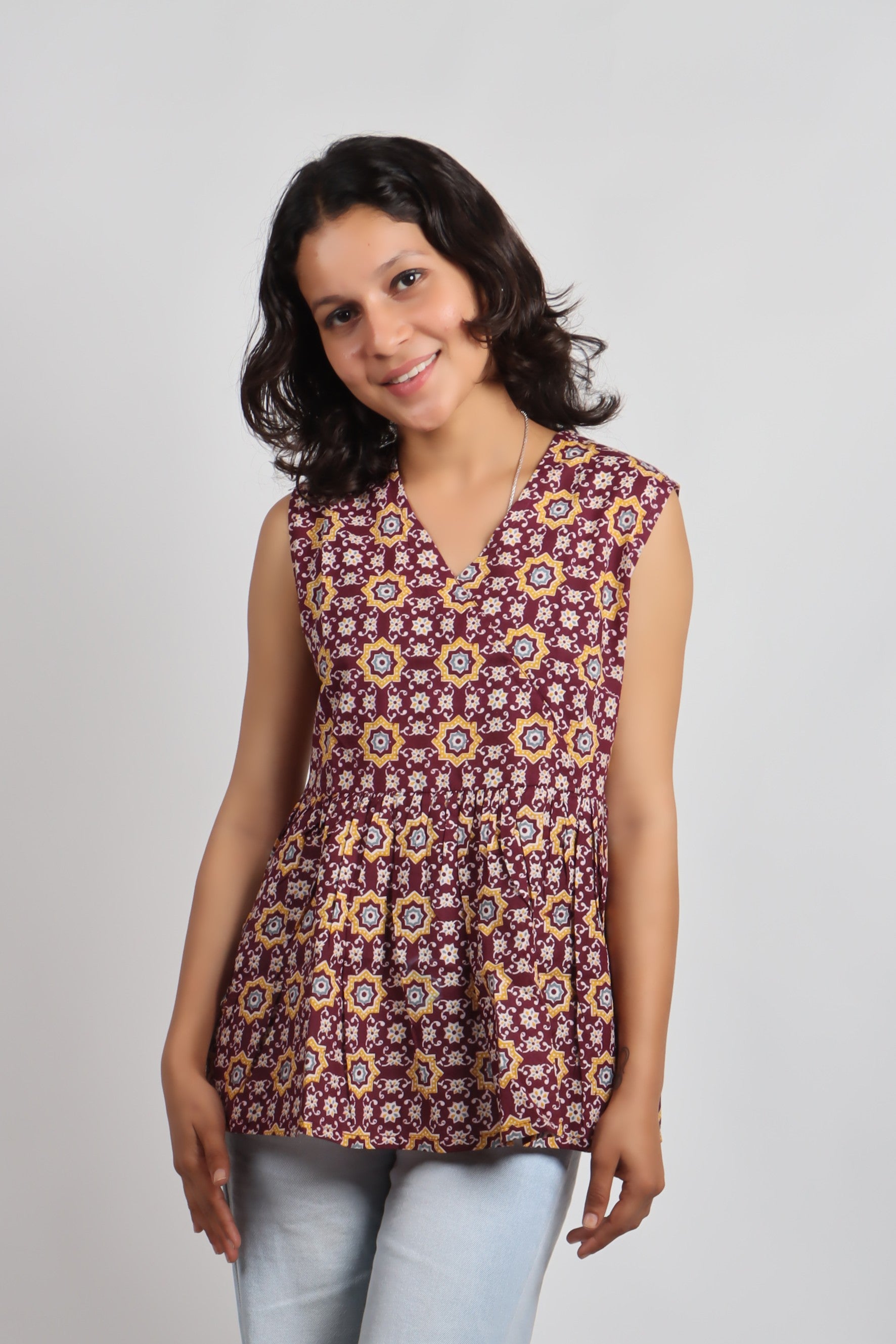 ✨ Product Description: Embrace timeless charm with the Bannisaa Vintage Garden Kurti, a delightful piece that brings together classic silhouettes with contemporary comfort. This sleeveless wonder features intricate floral and geometric patterns that dance across the fabric, creating a vintage-inspired look that's perfect for modern styling. The flattering peplum design cinches at the waist before flowing into a graceful flare, offering a feminine silhouette that pairs beautifully with jeans, palazzo pants, or skirts. Available in three stunning colorways - rich burgundy red, deep wine purple, and earthy olive green - each telling its own style story.