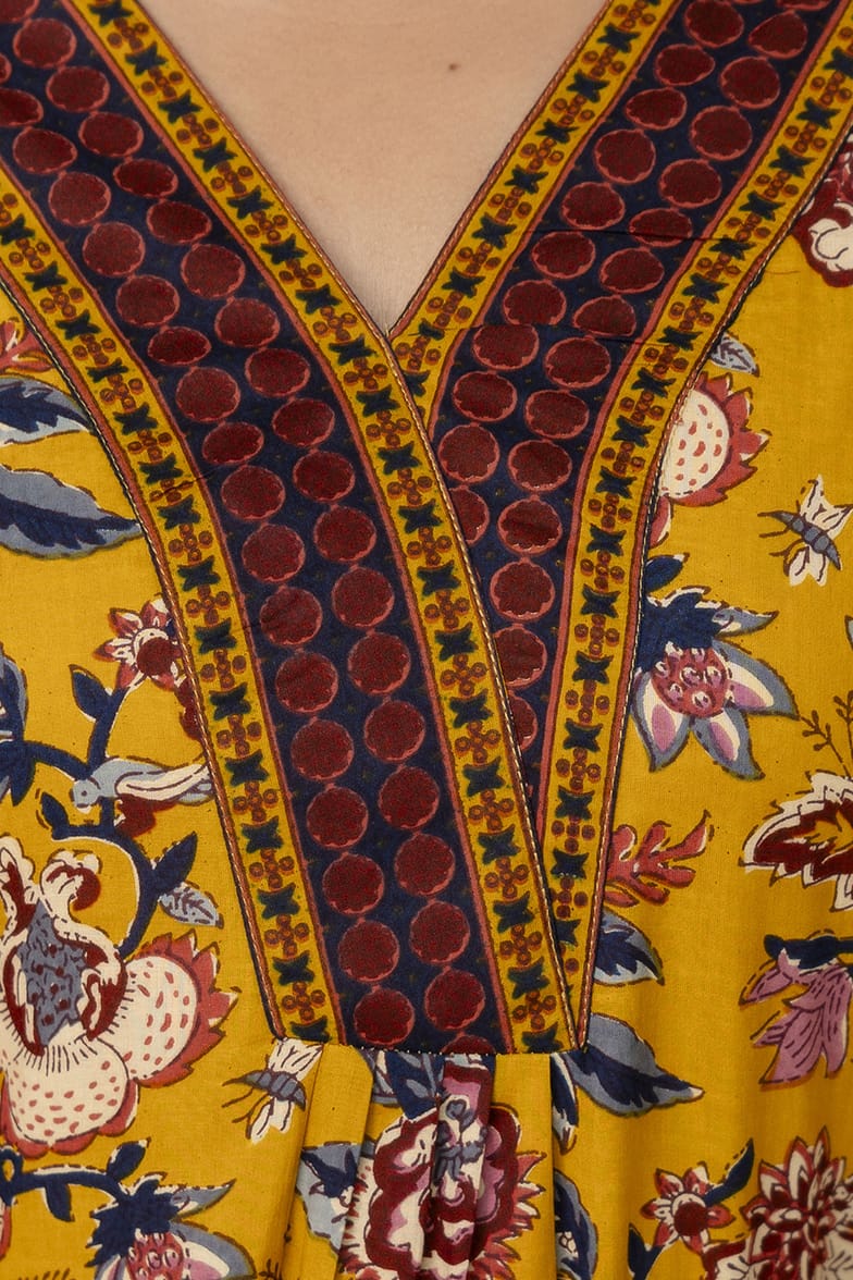 Color: Mustard Yellow with multicolor floral and maroon border accents