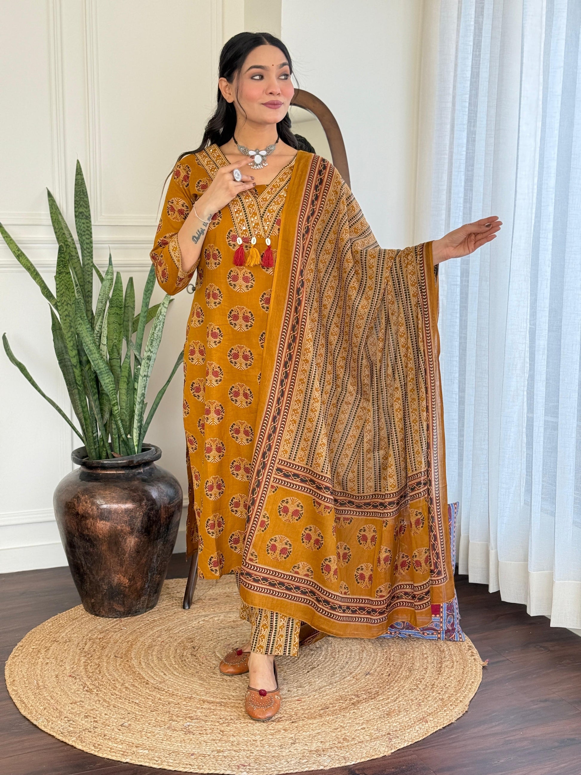 Celebrate this festive season with effortless elegance. The Mustard Bloom Set from Bannisaa is crafted in pure cotton with a breezy A-line silhouette, enhanced by intricate hand-sequence embroidery and playful tassel highlights. Paired with matching plazos and a soft mulmul dupatta, this set is perfect for morning rituals, evening get-togethers, and every occasion in between. A heritage-inspired look that blends comfort with charm.